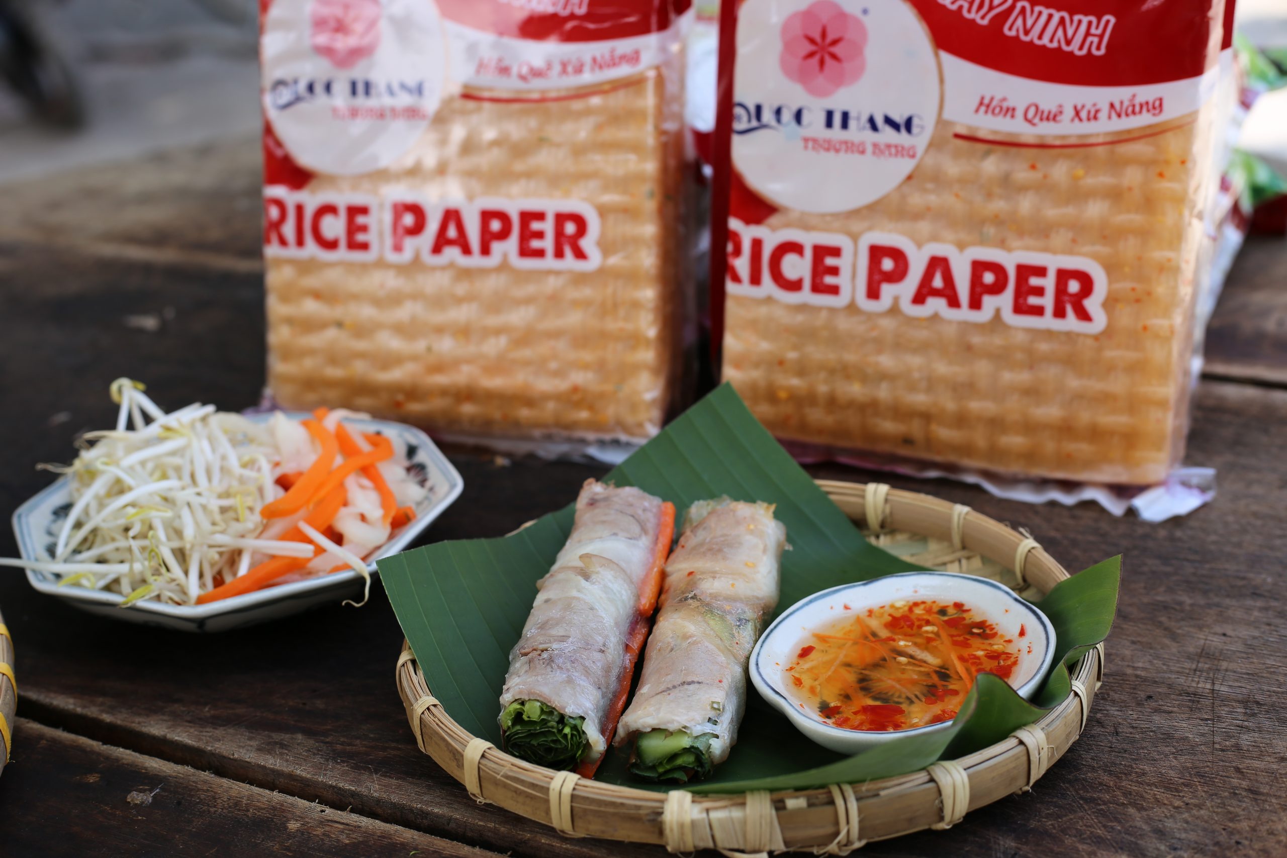 Bánh tráng ( có thể nhúng nước tùy người ăn) cuộn chung với thịt, một ít rau, dưa, khế, chuối chát… chấm nước mắm chua ngọt ngon ơi là ngon.